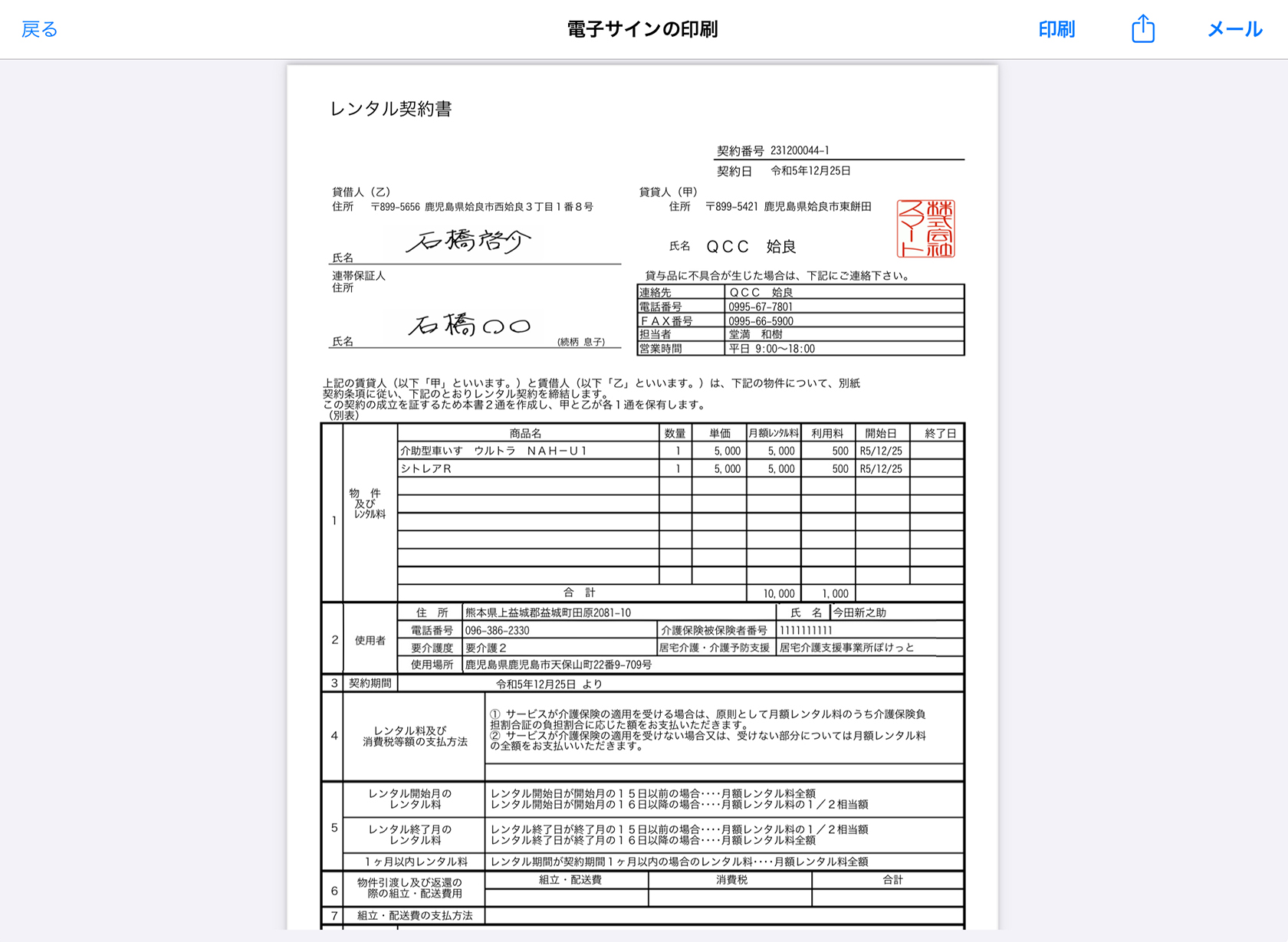 smart shake+で作成した契約書にタブレットで電子サインを頂き、一度の署名で他の帳票へも反映させることができます。福祉用具専門相談員、利用者様、ご家族様への負担を軽減できます。